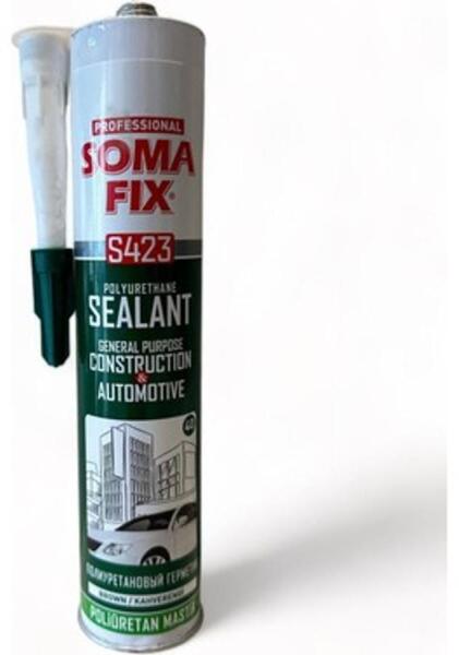 SomaFix PU tömítő barna 280ml (S423) Termékinf ormáció: Egykomponensű , kettős célú pisztolyos poliuretán tömítő és szigetelő anyag, amely tartósan megőrzi rugalmasságát. Kinyomást követően a légkör nedvessége következtében gyorsan megköt. Festhető. Könnyen elsimítható. Nem korrodál. Víz és időjárás álló. Sokféle ragasztási és tömítési feladatra alkalmas. Jól rögzíti a cement alapú anyagokat, a téglát, a kerámiákat, üveget, fémeket, faanyagokat, a lakkozott felületeket, a poliésztert, az akrilt és a különféle műanyagokat. Alkalmas bármely anyagú ablak-és ajtókeret rögzítésére, alátétek, fedők, vízhatlan záróelemek, illetve bármilyen könnyű szerkezetű építőelem rögzítésére, továbbá víztartályokhoz és silókhoz is. Használati utasítás: Az alapfelületnek tiszta, por, szennyeződés, rozsda és zsírmentes kell lennie. Vágja le a hegyét, és szerelje fel a kinyomó pisztolyra. Vigye fel a terméket. 24 órán át védje a víztől. Műszaki adatok: